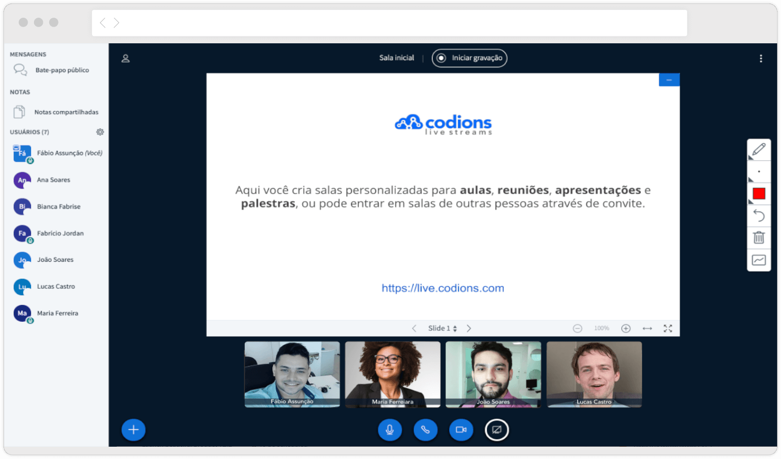 Com o Codions Live você pode gravar suas sessões e até compartilhar posteriormente com qualquer pessoa.